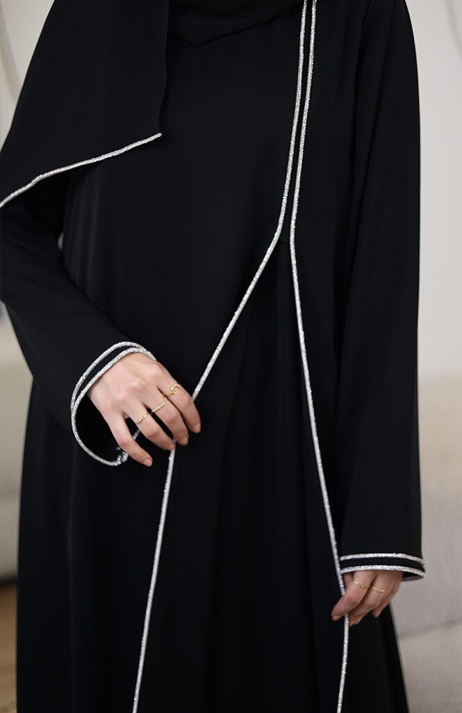 عباية سوداء سادة سواريه من عبايه فيفر بتصميم أنيق يجمع بين البساطة والفخامة، تناسب السهرات والمناسبات الخاصة بإطلالة راقية وعصرية.
