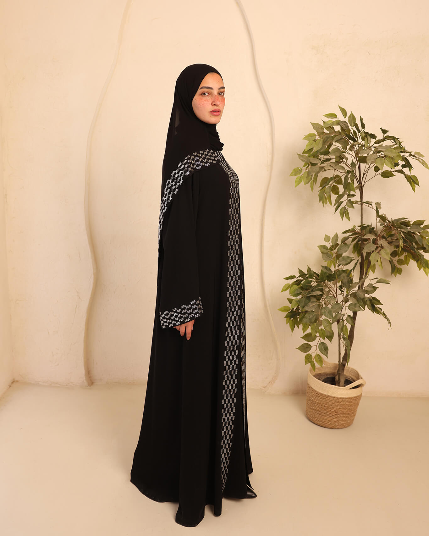 تأتي العباية بقصة واسعة وانسيابية تمنحك راحة وثقة أثناء الحركة، مع خامة ناعمة تحافظ على شكلها الأنيق طوال اليوم. توزيع الاسترس الفضي والذهبي والأسود تم بعناية ليخلق توازناً بصرياً رائعاً يضفي لمسة فنية مبهرة على التصميم، ويمكن تنسيقها مع حقيبة بسيطة وحذاء بكعب أنيق لإكمال الإطلالة بكل انسجام.